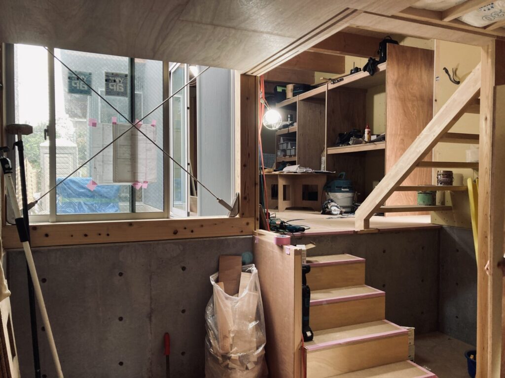 半地下部分は1Fから1m下げ、申請上地下扱いとすることで柱や梁を現しにするデザインを可能にしています。