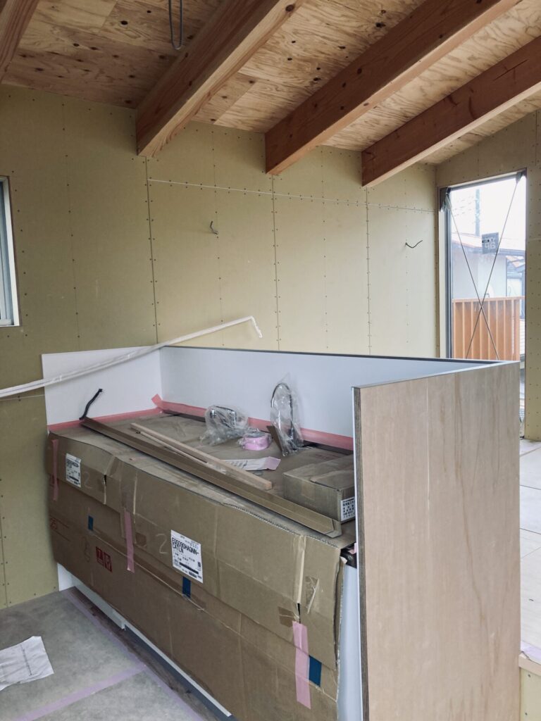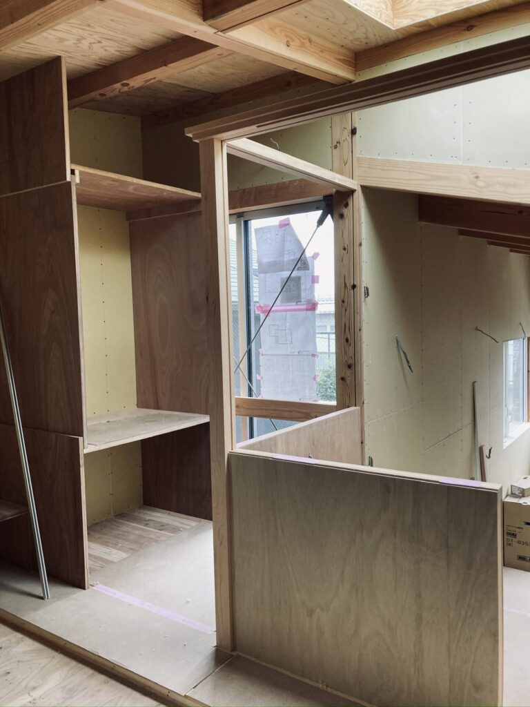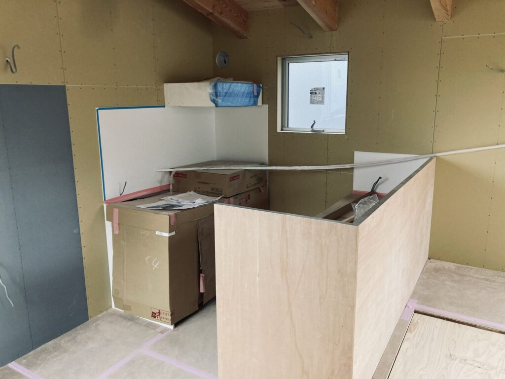 キッチンはクリナップの既製品を採用しております。リビング側から見た際の雰囲気を損なわないために、衝立を周りの仕上げと合わせてラワン合板にし、内側は汚れを拭き取りやすいようにキッチンパネル貼りにしています。