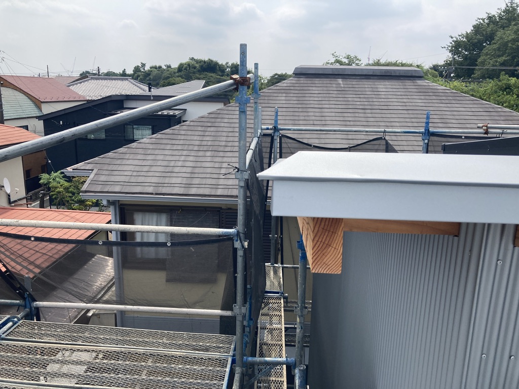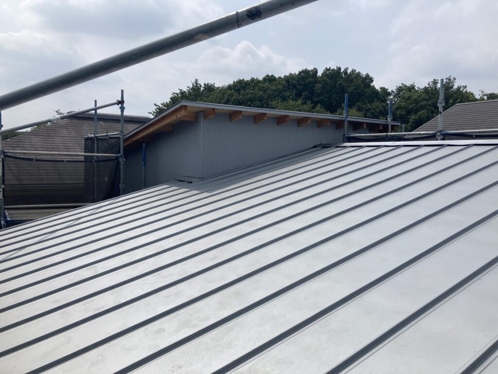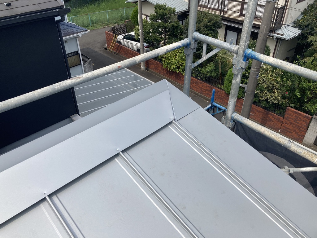屋根は同じガルバリウム鋼板の縦平葺きとしています。縦平葺き自体は既製品をしているのですが、棟をスッキリ見せるためにその部分のみ板金屋さんに折り曲げ加工して頂きました。