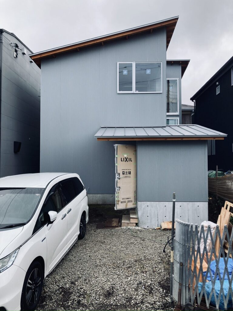 道路側は必要最小限の窓のみ配置した、片流れの屋根が重なり合うシンプルな外観です。外壁はガルバリウム鋼板の小波板を採用。コストと意匠性のバランスが良いので最近はよく提案させて頂いております。