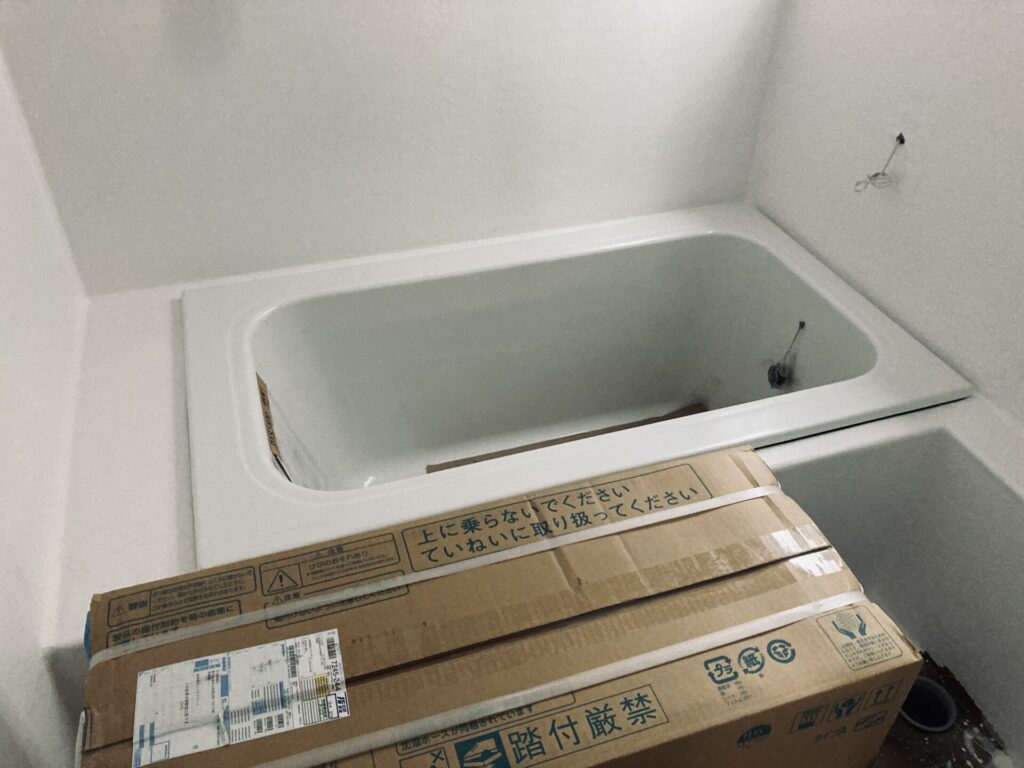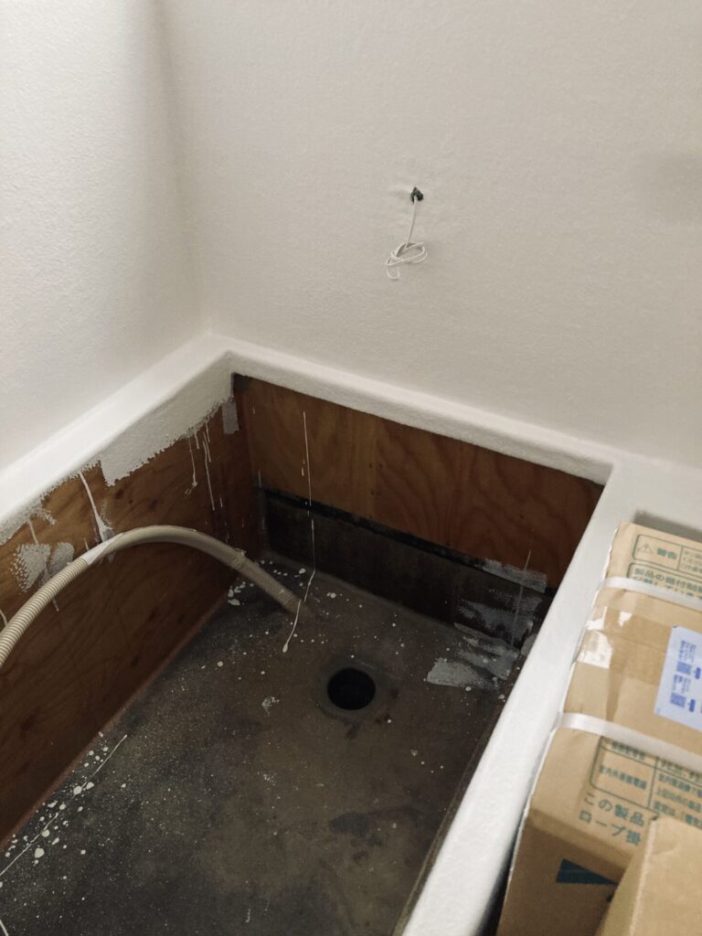 浴室はFRP防水の上に塗装をしただけのシンプルなもの。浴槽はポリバスを採用することで既製のユニットバスより安価に仕上げています。
