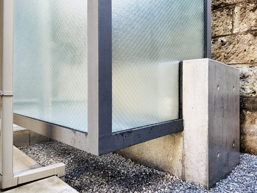 地中から伸びるコンクリートの基礎に、重なり合う鉄骨フレームを緊結することで、箱全体が浮遊するような構成をとっています。この鉄骨フレームは構造体であると同時に、ガラスや扉の枠材を兼ねており、最小限の部材で機能を完結させる構造の統合を試みました。