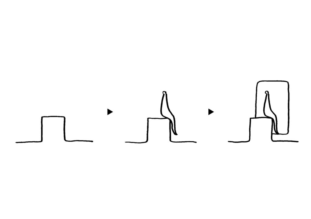 喫煙所という限定的な用途を超え、人が羽を休めるための原初的なシェルターとなるよう、人が座る場所を屋根と壁だけが覆うだけの簡潔な構成にしております。
