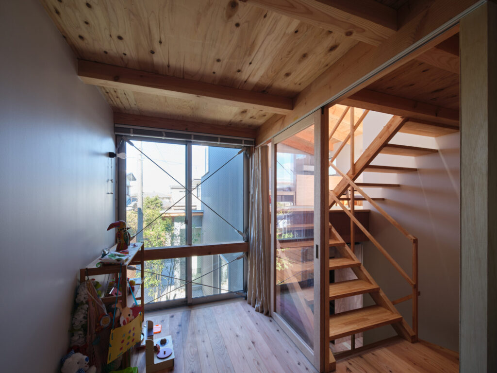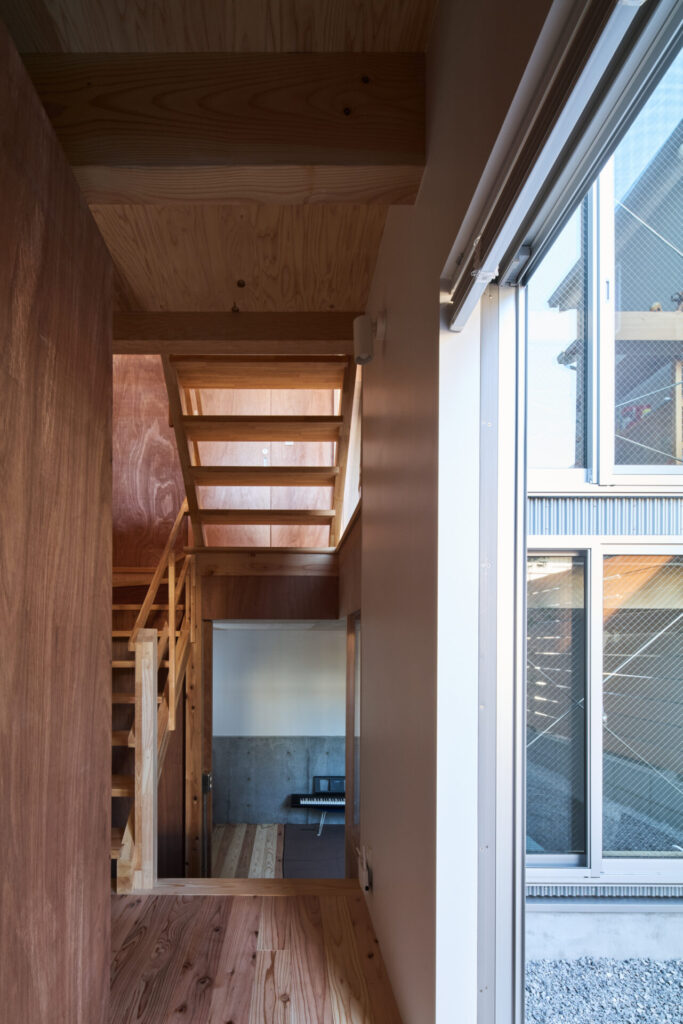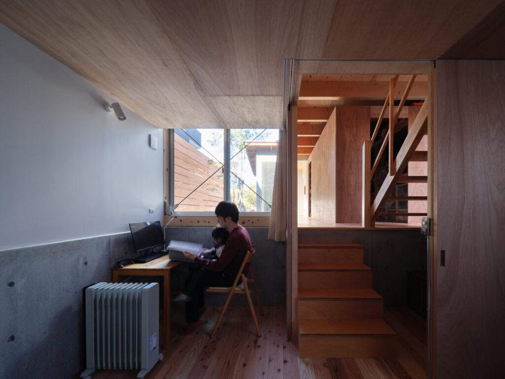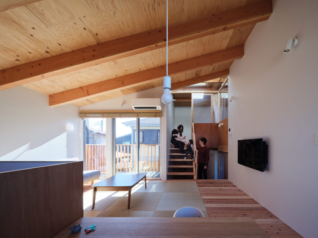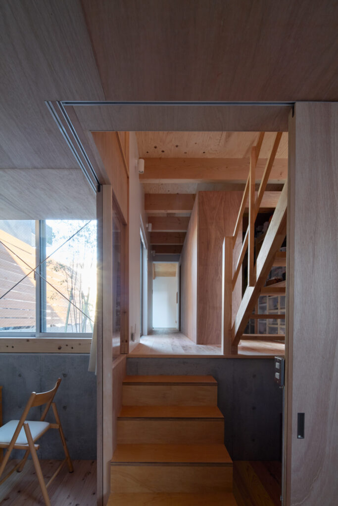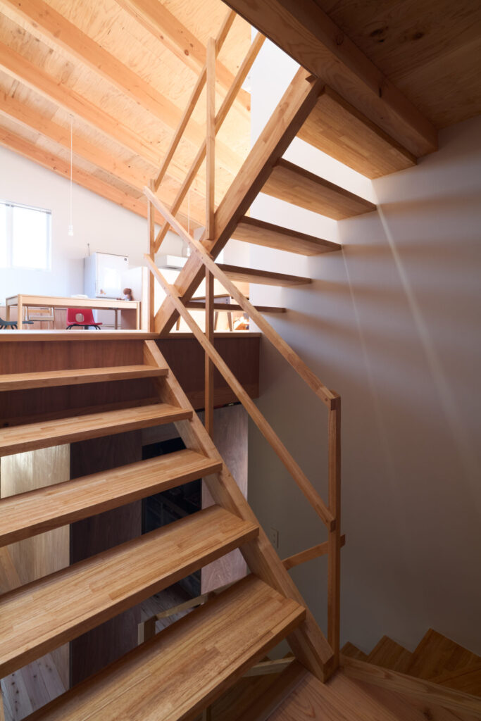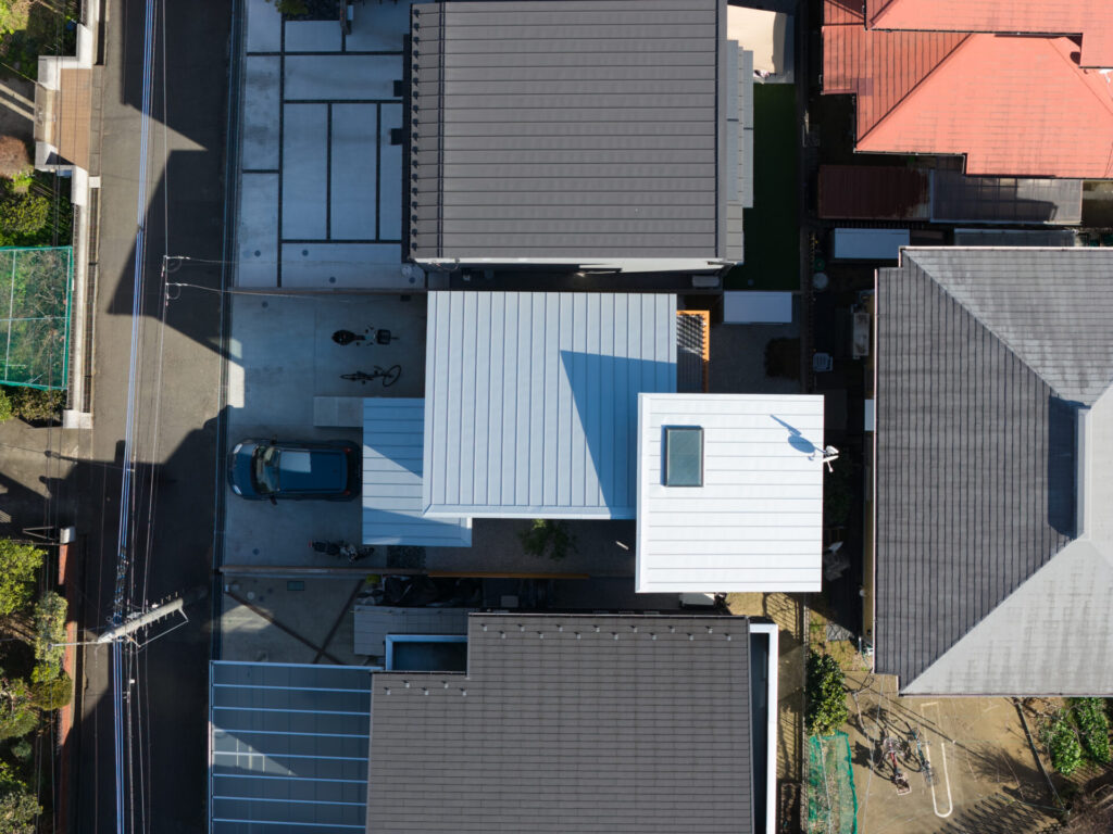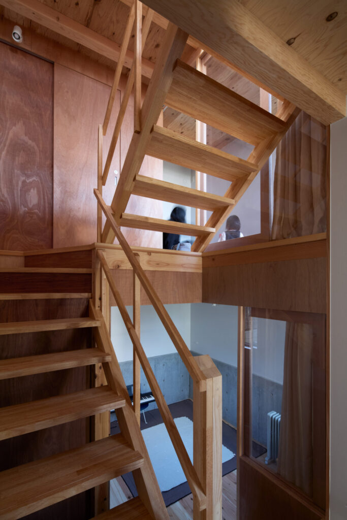 上下にずらすことでそれぞれの階を分断することなくつなげ、左右にずらすことで各々の部屋に明るさと眺望を確保しています。上階と下階、外と中が有機的に繋がり混じり合うことで、面積以上の広さを感じる事ができる住まいを目指しています。
