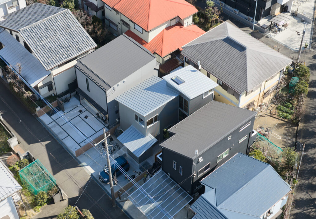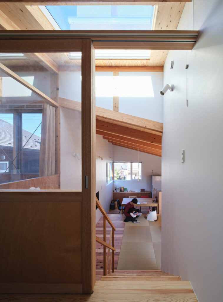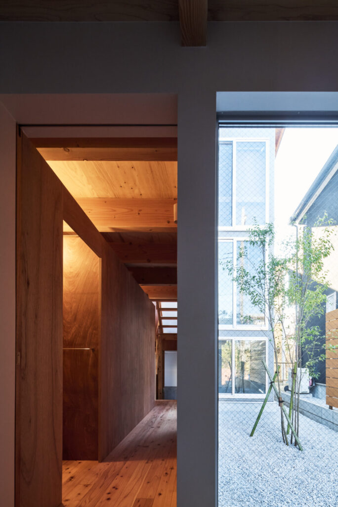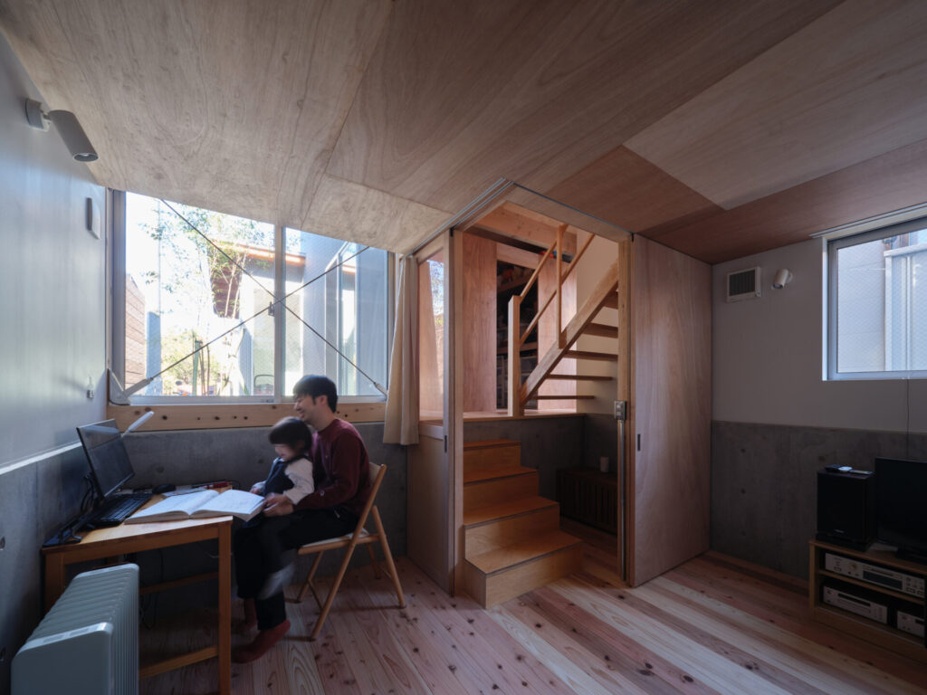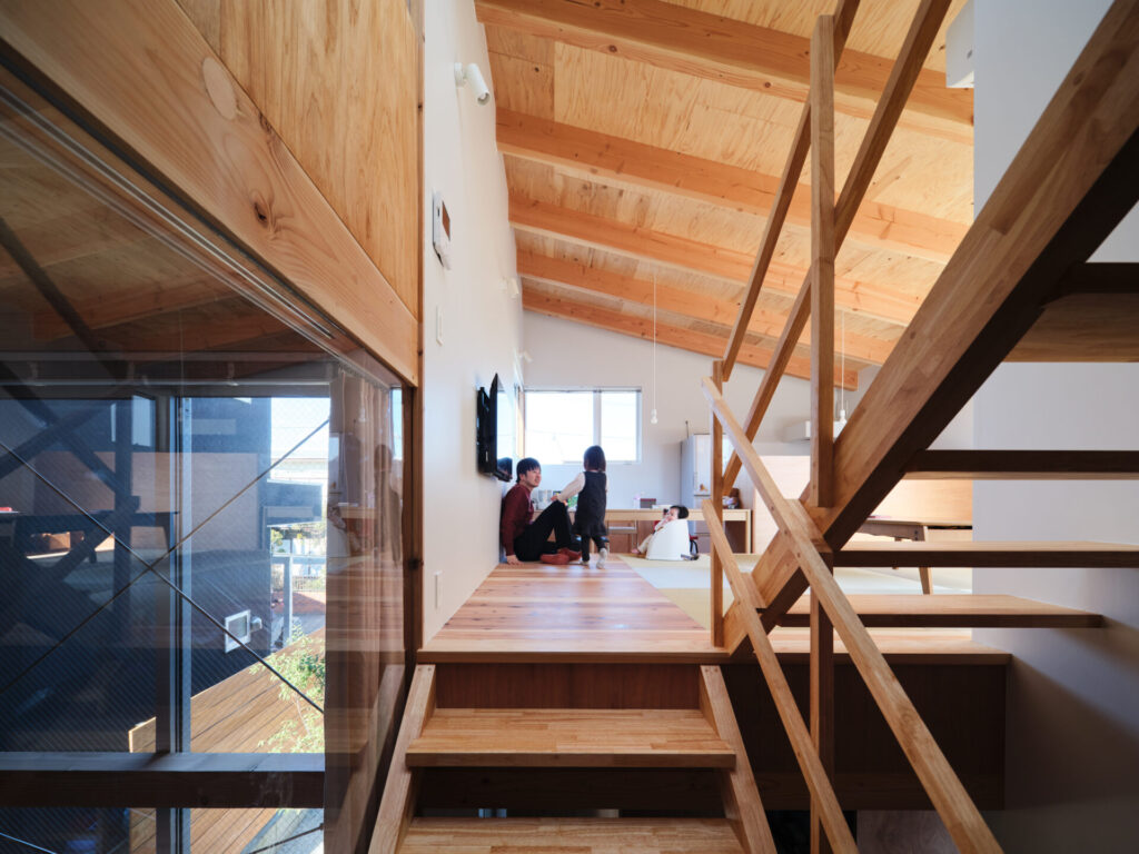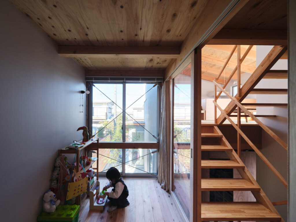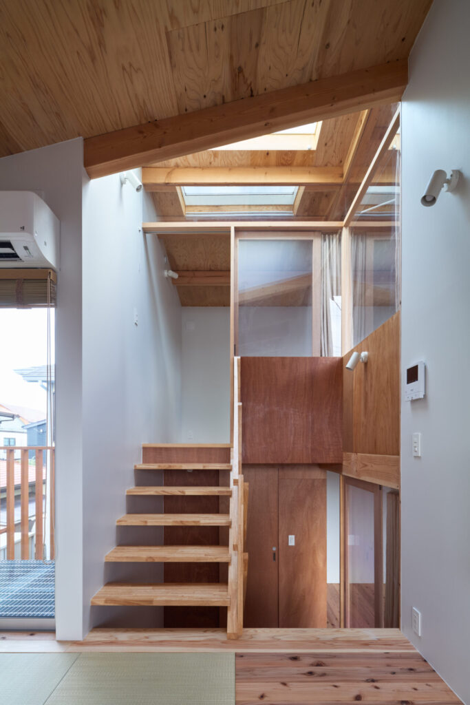 上下にずらすことでそれぞれの階を分断することなくつなげ、左右にずらすことで各々の部屋に明るさと眺望を確保しています。上階と下階、外と中が有機的に繋がり混じり合うことで、面積以上の広さを感じる事ができる住まいを目指しています。